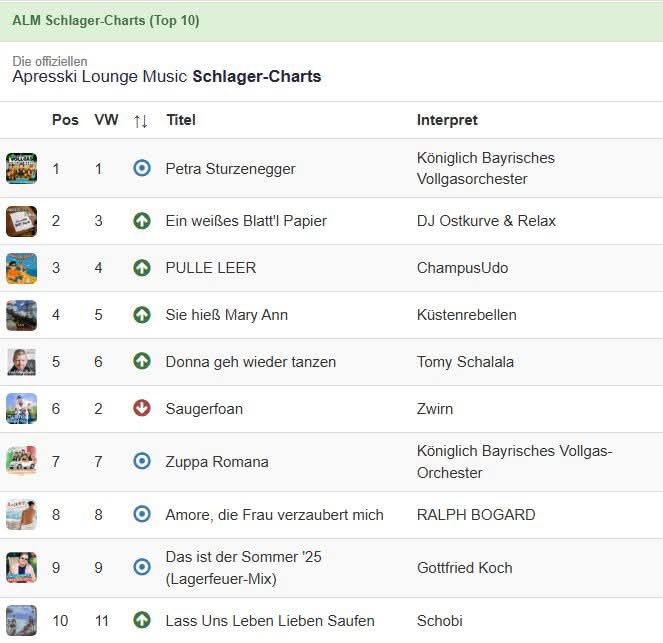 Mit "Donna geh wieder tanzen" hab ich es bei www.apresskilounge.de in den Schlagercharts auf Platz 5 geschafft (Stand: 05.09.2025)